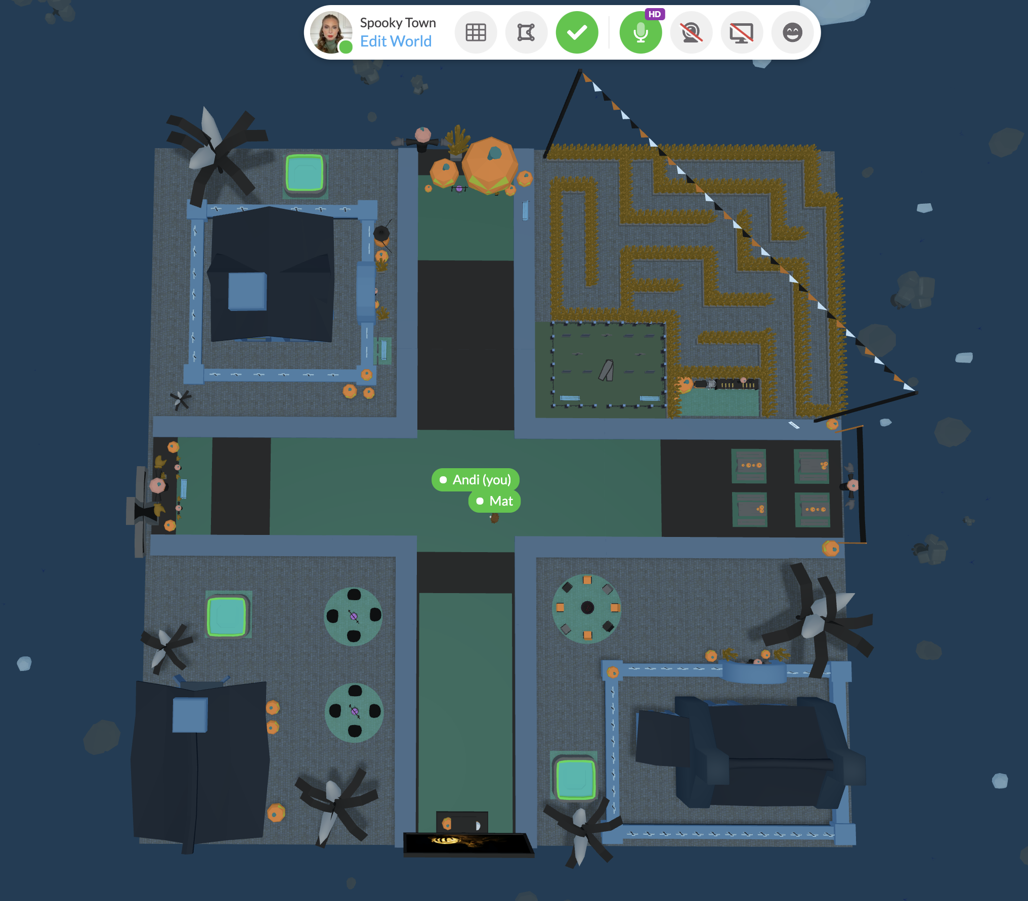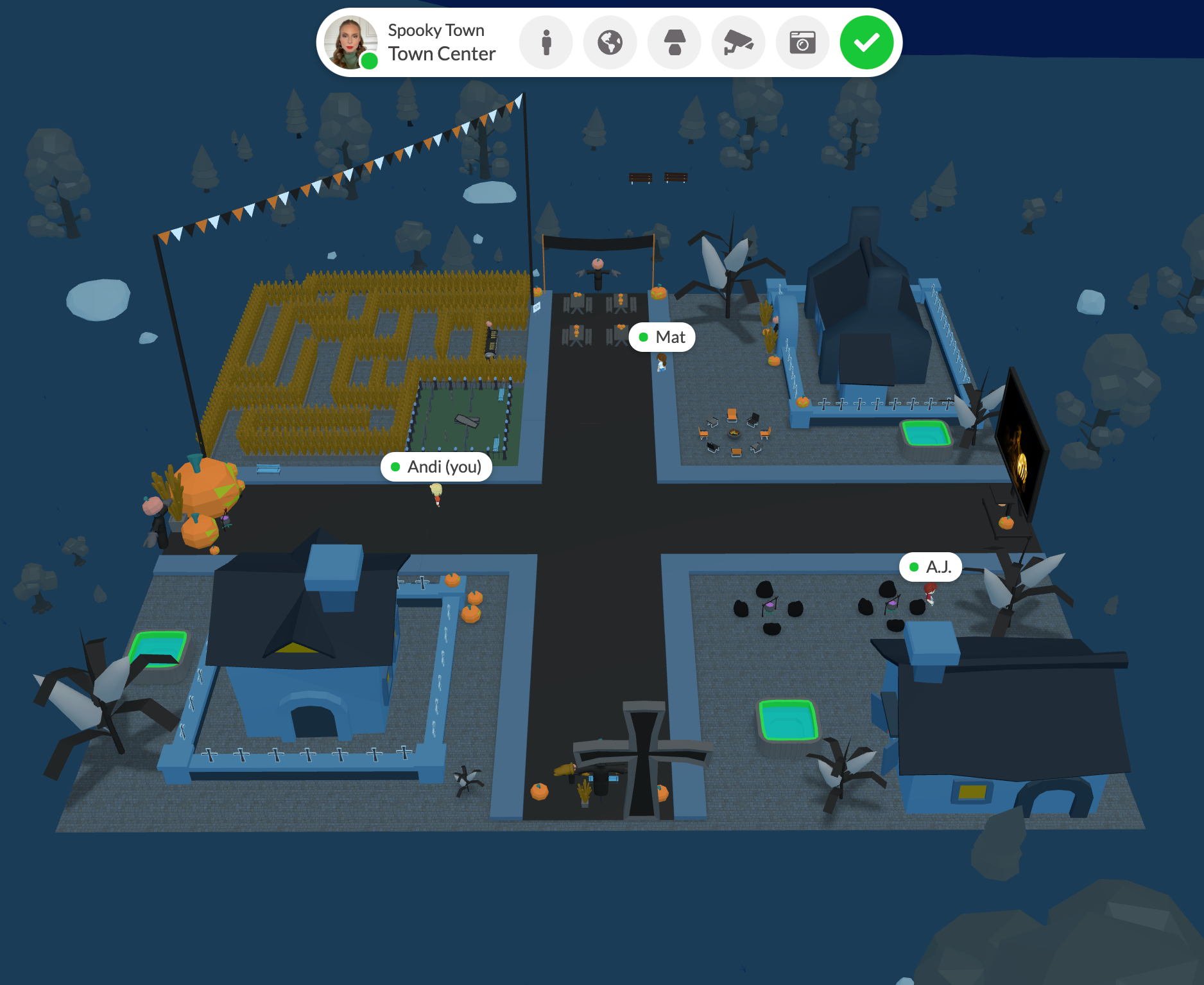 The Halloween Party office also includes our newest functionality, Spatial Audio Zones. Highlighted in green in the image above, this will allow your team to connect more naturally, just as if they were in the office roaming around in their best costume. If you're interested in learning more about Spatial Audio, and the best use case for the event you want to host, email me (AJ@Spotvirtual.com)