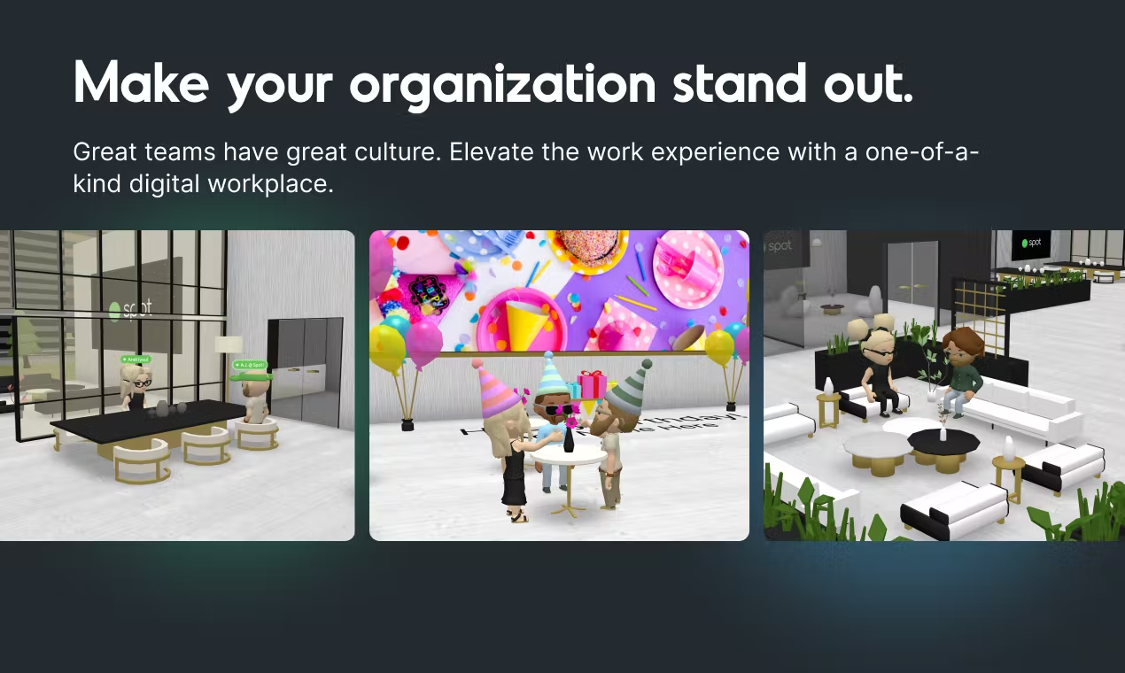 When we first provided an introduction to Spot a little over a year ago, our product focused on providing a virtual office that tailored a company's culture and brand to the workplace experience. We started Spot because we care about the overall well being of people and communities. Our experiences taught us that a shared environment is key for team members to connect with each other, bring serendipity to the workplace, and to have a high-performing organization. Not to mention, work is a big part of your life and should be a little fun!